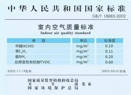 这个标准是由国家质量监督检验检疫总局、卫生部、国家环保总局于2002-12-19发布,2003年3月1日实施的。在这个标准里,规定了室内甲醛浓度安全限值不得高于0.1毫克/立方米,是推荐性标准,非强制性标准。这个标准主要用于衡量人居室内环境健康的依据,在这个标准中不仅有甲醛、苯等装修有害气体,也对物理方面的温度、湿度、PM2.5等都有规范要求,涉及到的指标有19项。